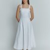 Linen midi dress with a detachable waistline and a high slit in relief. Strapless model with a hidden buttoned strap length adjustment. The product is lined with linen. The dress is decorated with handmade fringe on the neckline and straps. It has a hidden zipper in the center seam of the back.