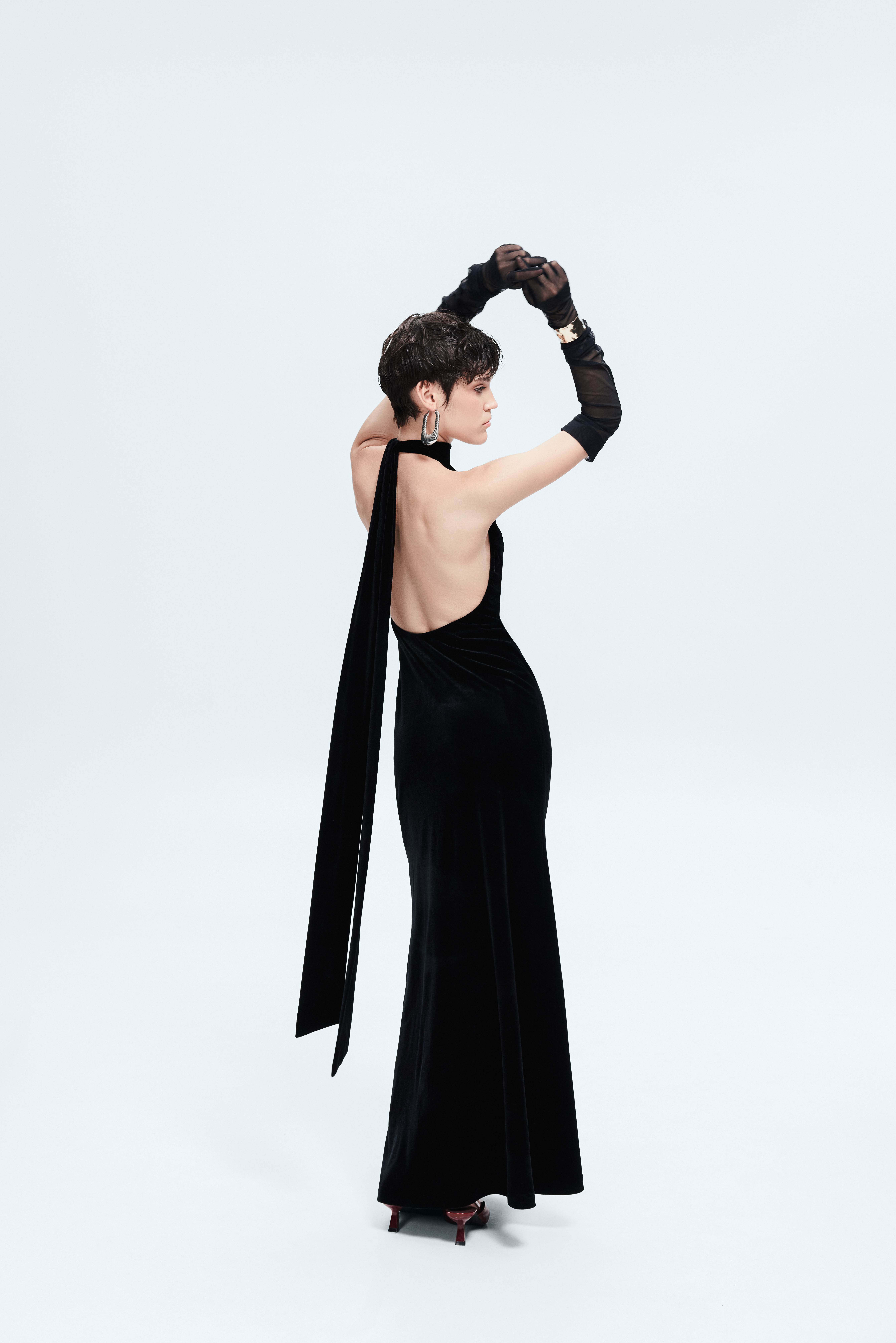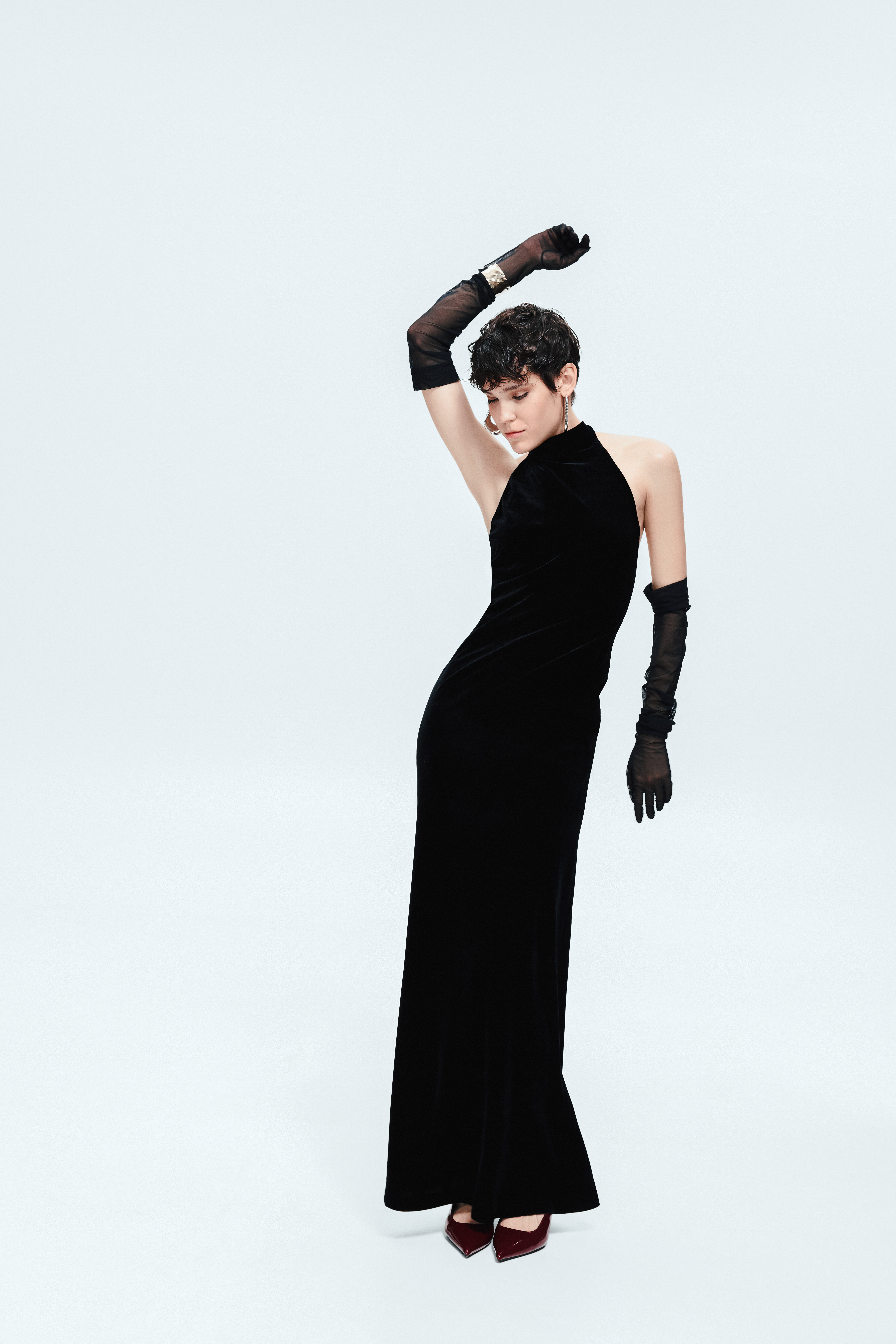High black gloves are the kind of detail that shifts the mood of an outfit at first glance. They add drama, femininity, and a subtle theatrical elegance visible only to those who notice nuance. Reaching the upper forearm, they visually elongate the arms, while the deep matte black makes them a universal choice for evening outings, photoshoots, cocktail looks, and stage styling.