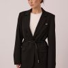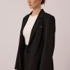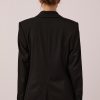 Black single-breasted jacket of semi-fitted silhouette. It has a one-button fastener and four non-functional buttons on the sleeves. The semi-glossy black buttons are made of natural Corozo material of plant origin.