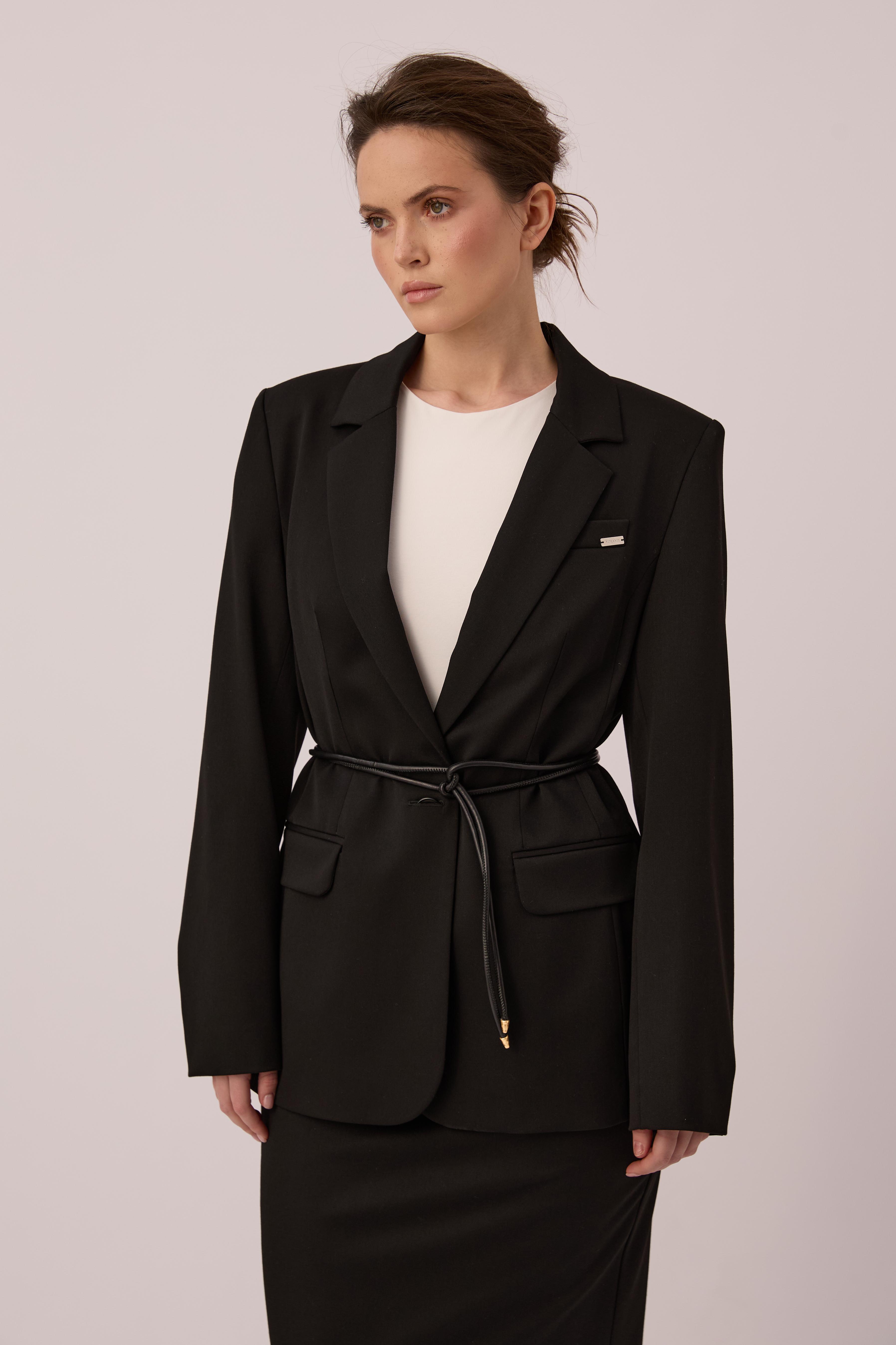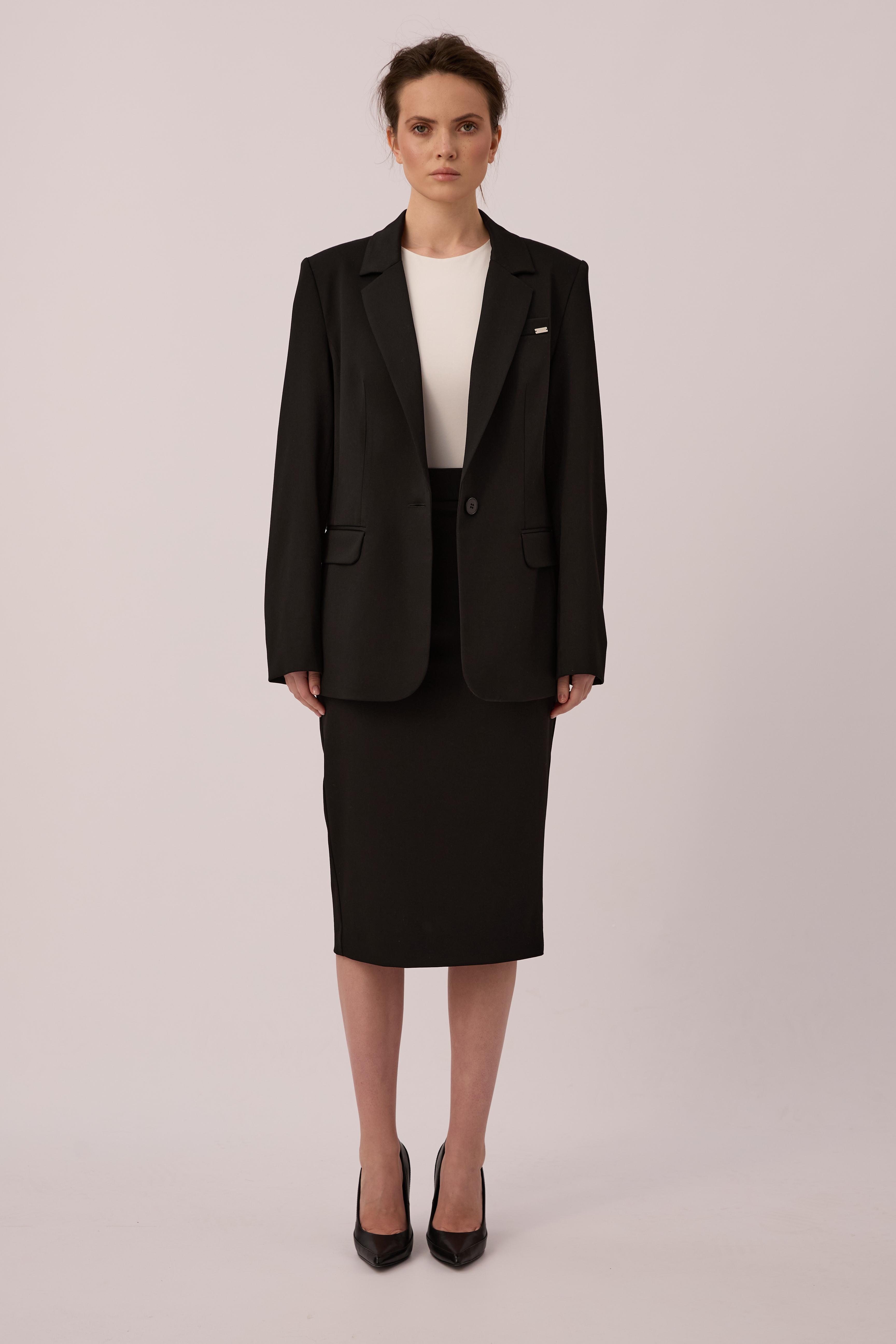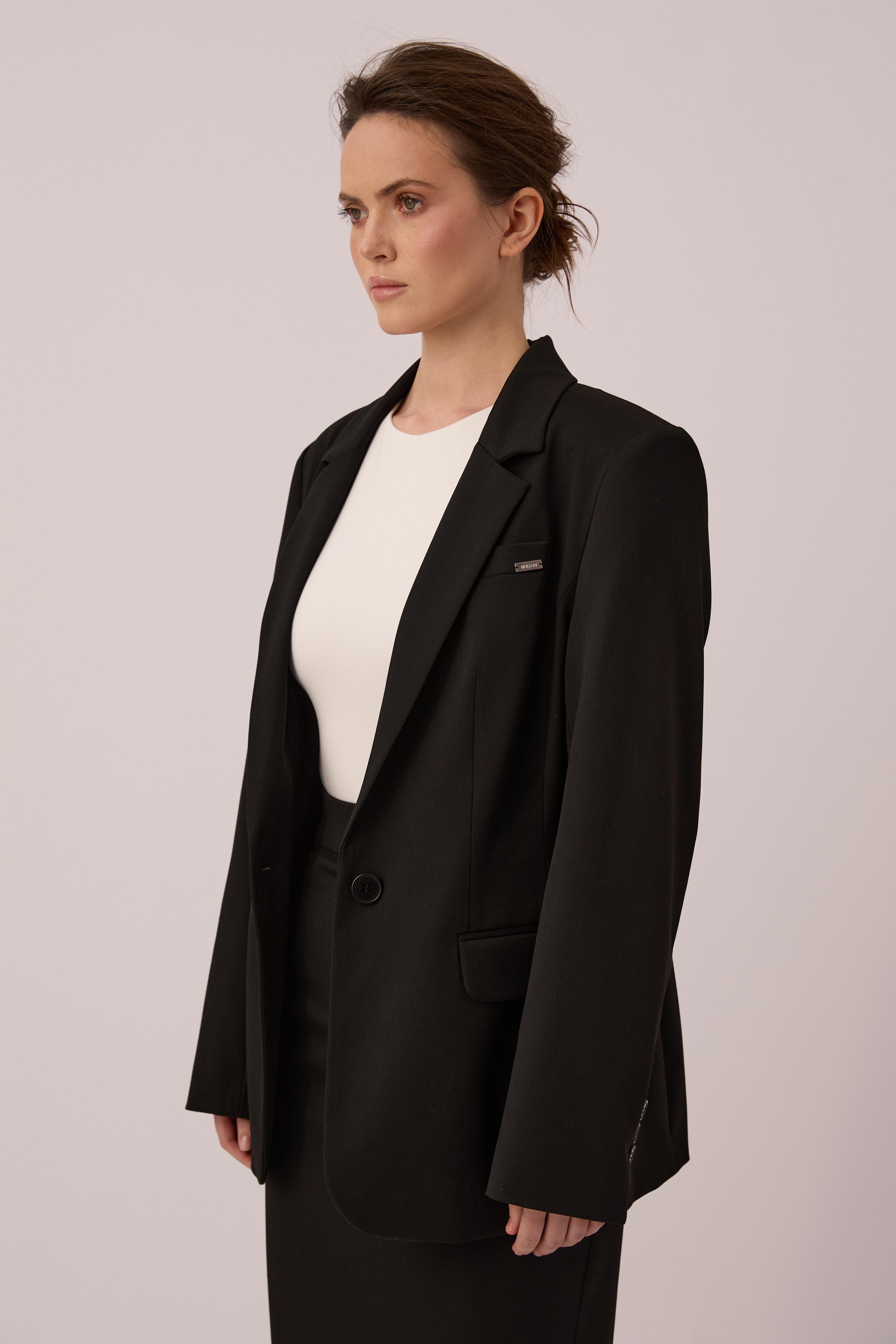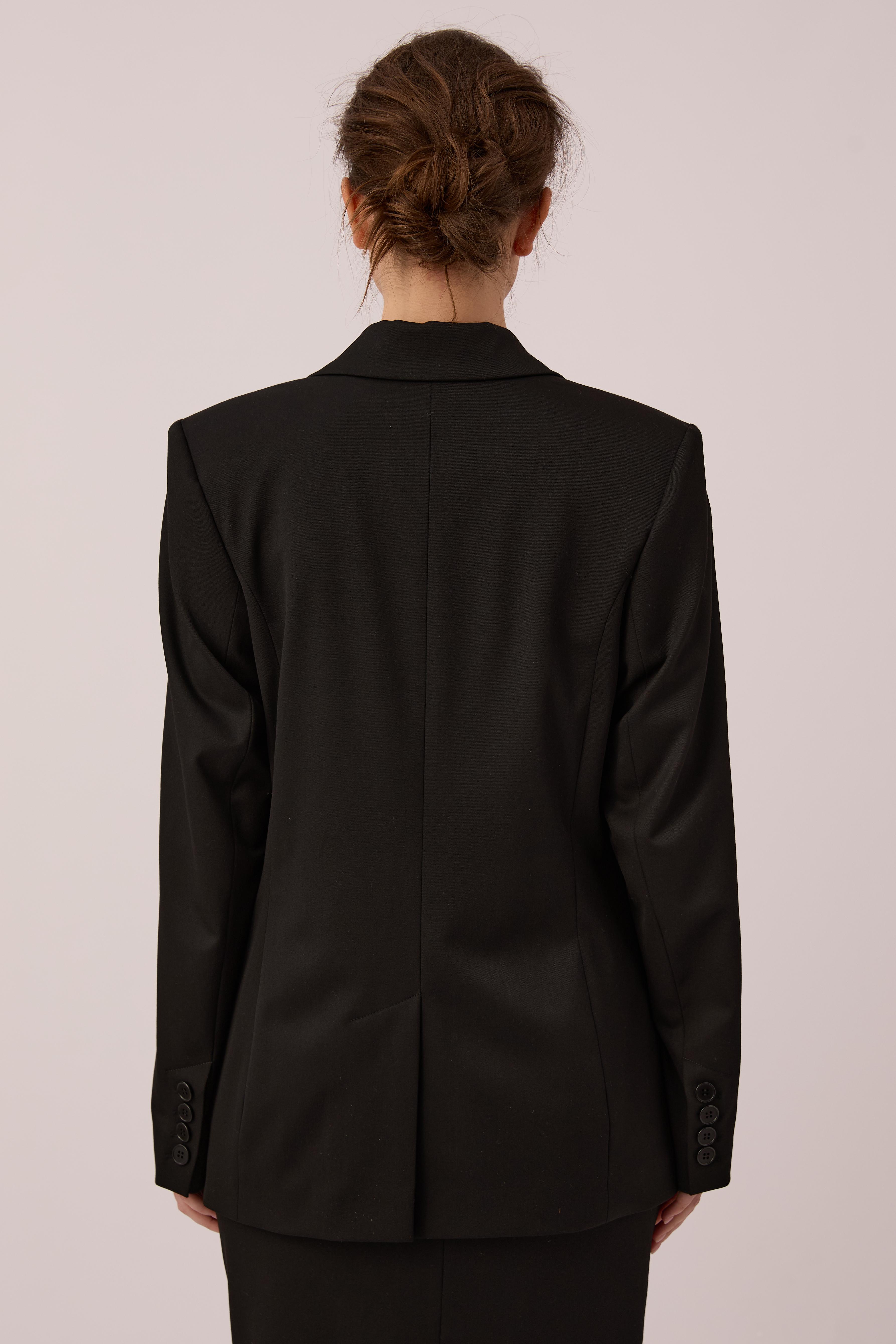 Black single-breasted jacket of semi-fitted silhouette. It has a one-button fastener and four non-functional buttons on the sleeves. The semi-glossy black buttons are made of natural Corozo material of plant origin.