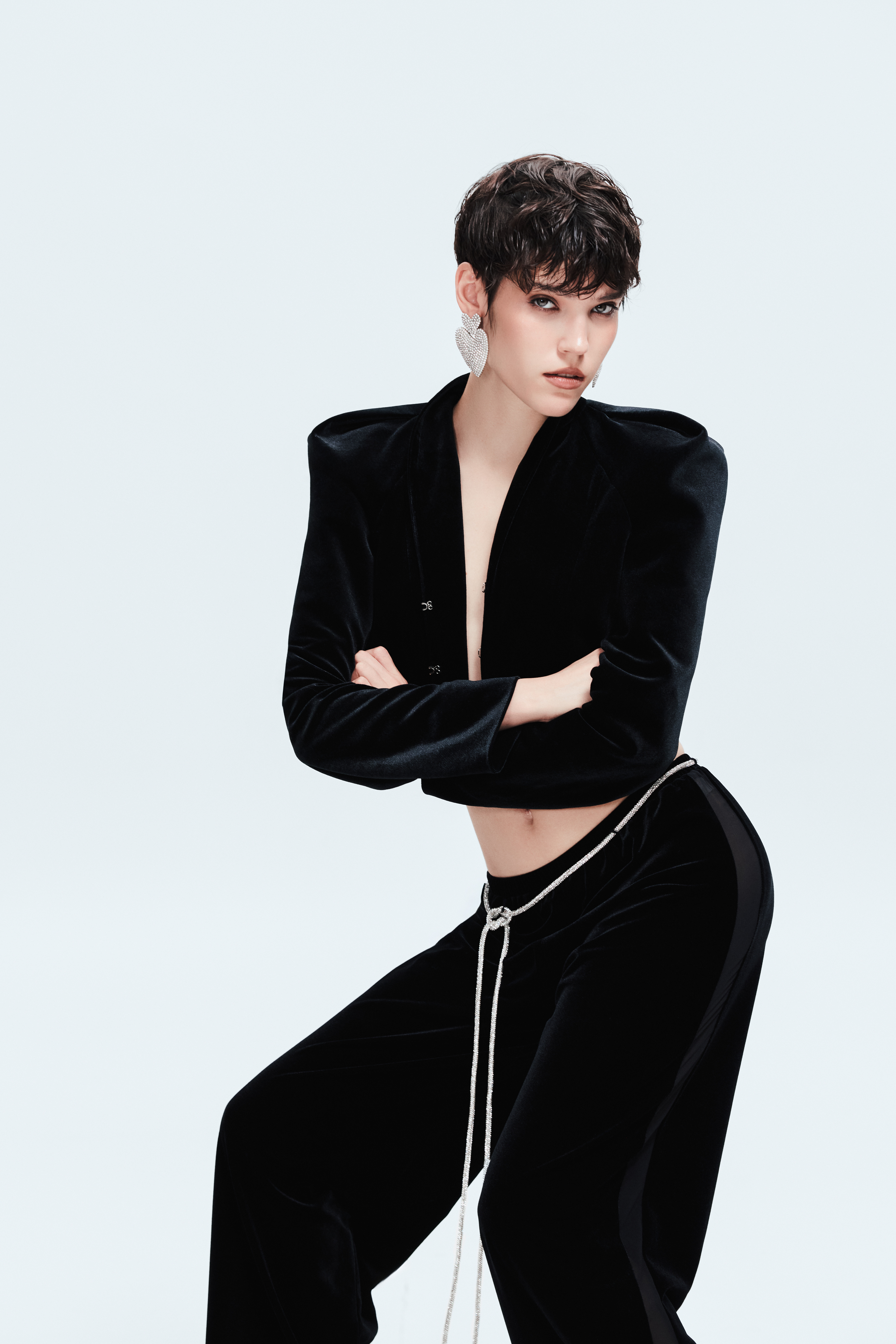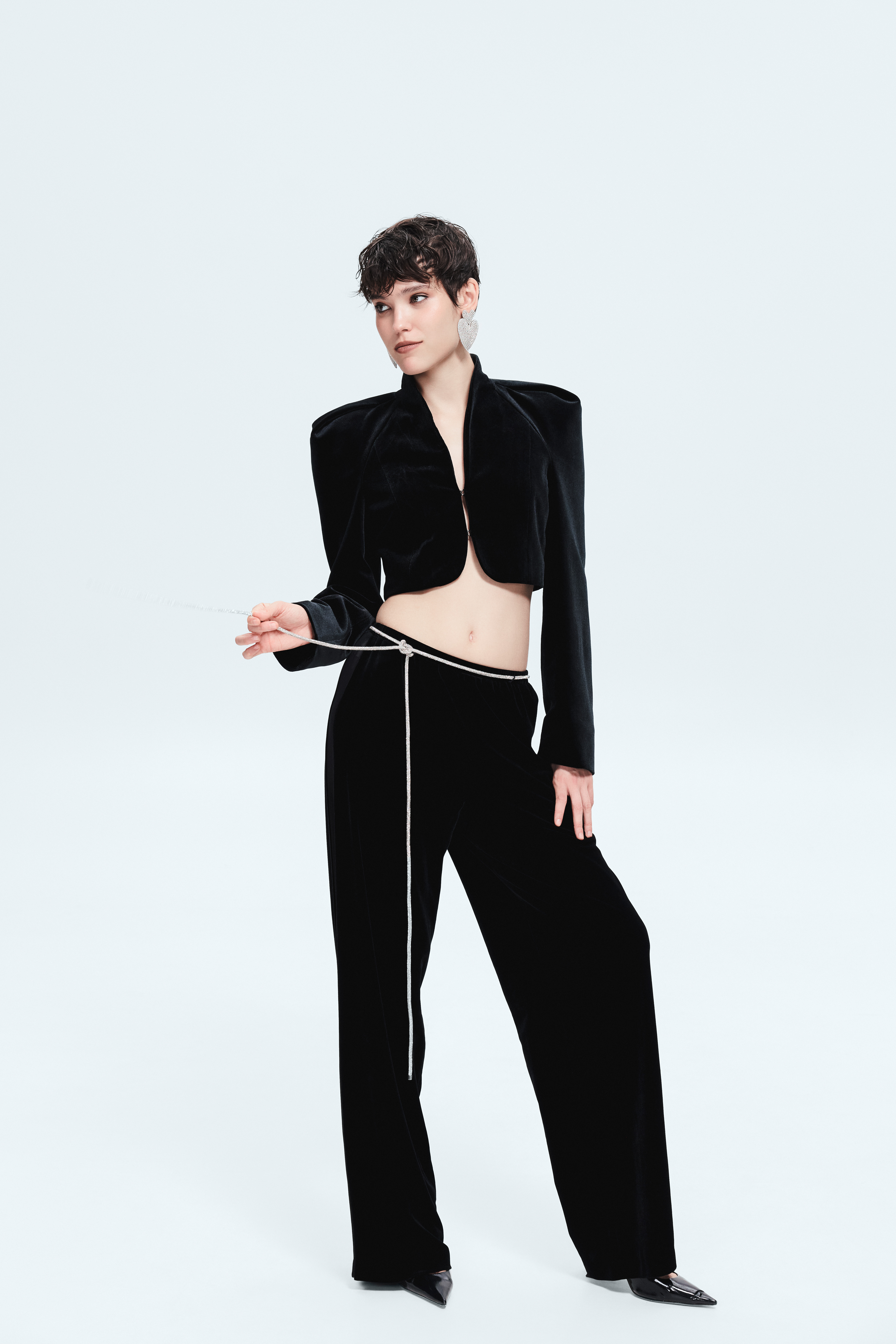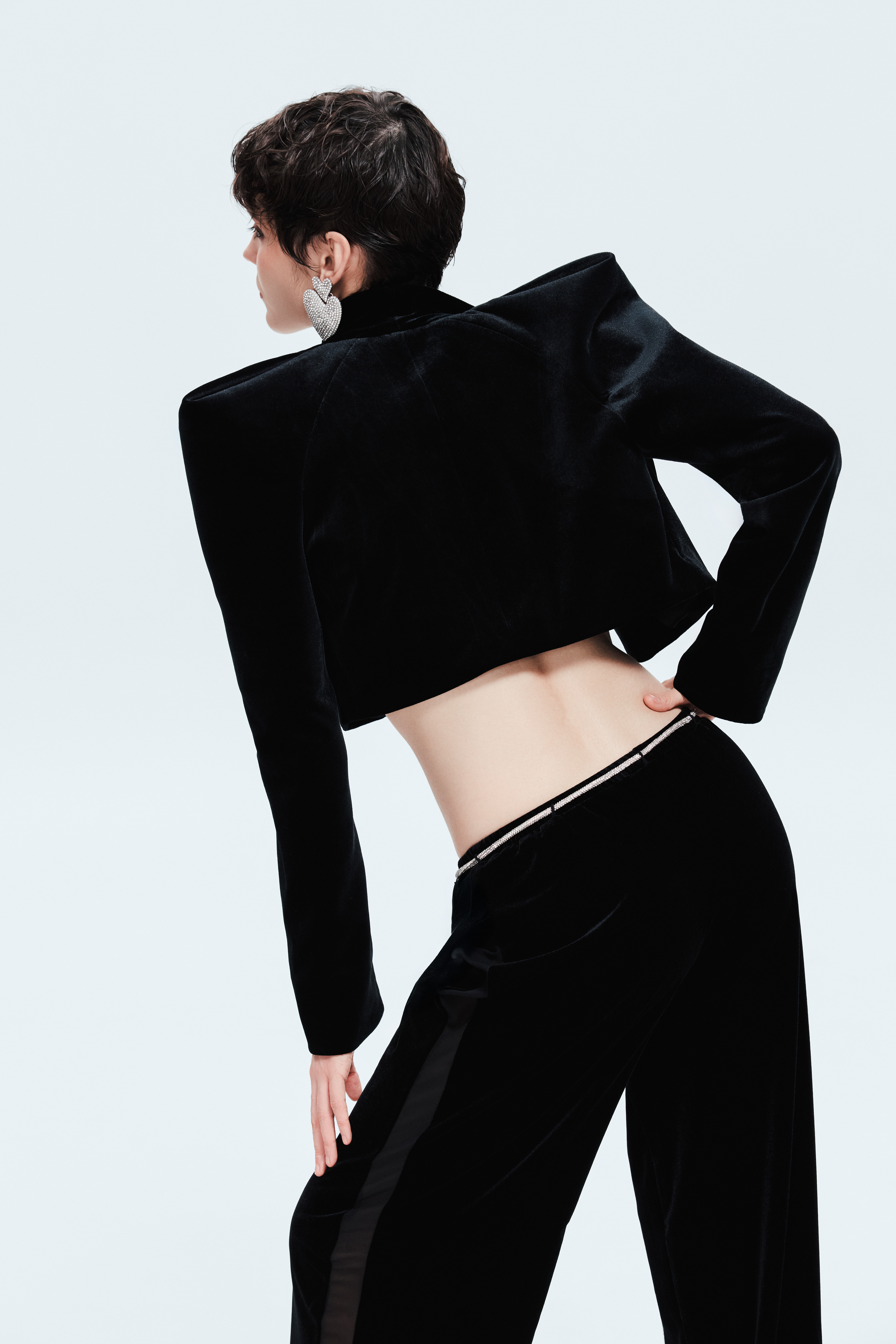 There’s a certain allure in a garment that can instantly refine your presence — and the cropped velvet jacket is one of those rare pieces. It carries the depth of nightfall in its color and transforms it into a modern, graceful statement. From the very first glance, it feels like a garment that adds intention and quiet confidence to your look.