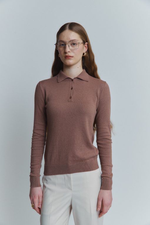 Women’s knitted polo collar jumper in cocoa color with cashmere. The model has long sleeves, a turn-down collar, a placket with a three-button fastener to match. The bottom of the sleeves and the bottom of the product are made of elastic.