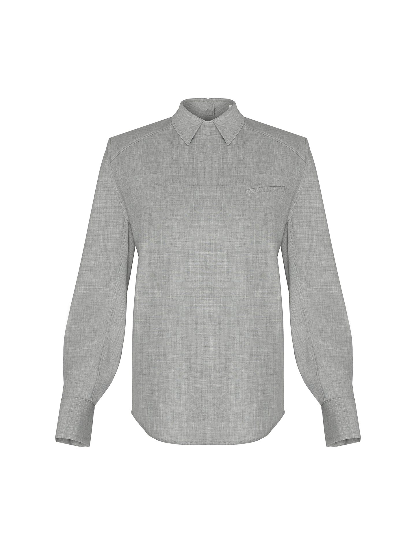 A subtle welt pocket on the chest introduces a restrained graphic accent, adding depth to the overall design. Cut detailing along the shoulder line enhances the architectural feel, creating a strong horizontal emphasis. These elements elevate the shirt beyond a basic piece, turning it into a carefully designed statement within a wardrobe.