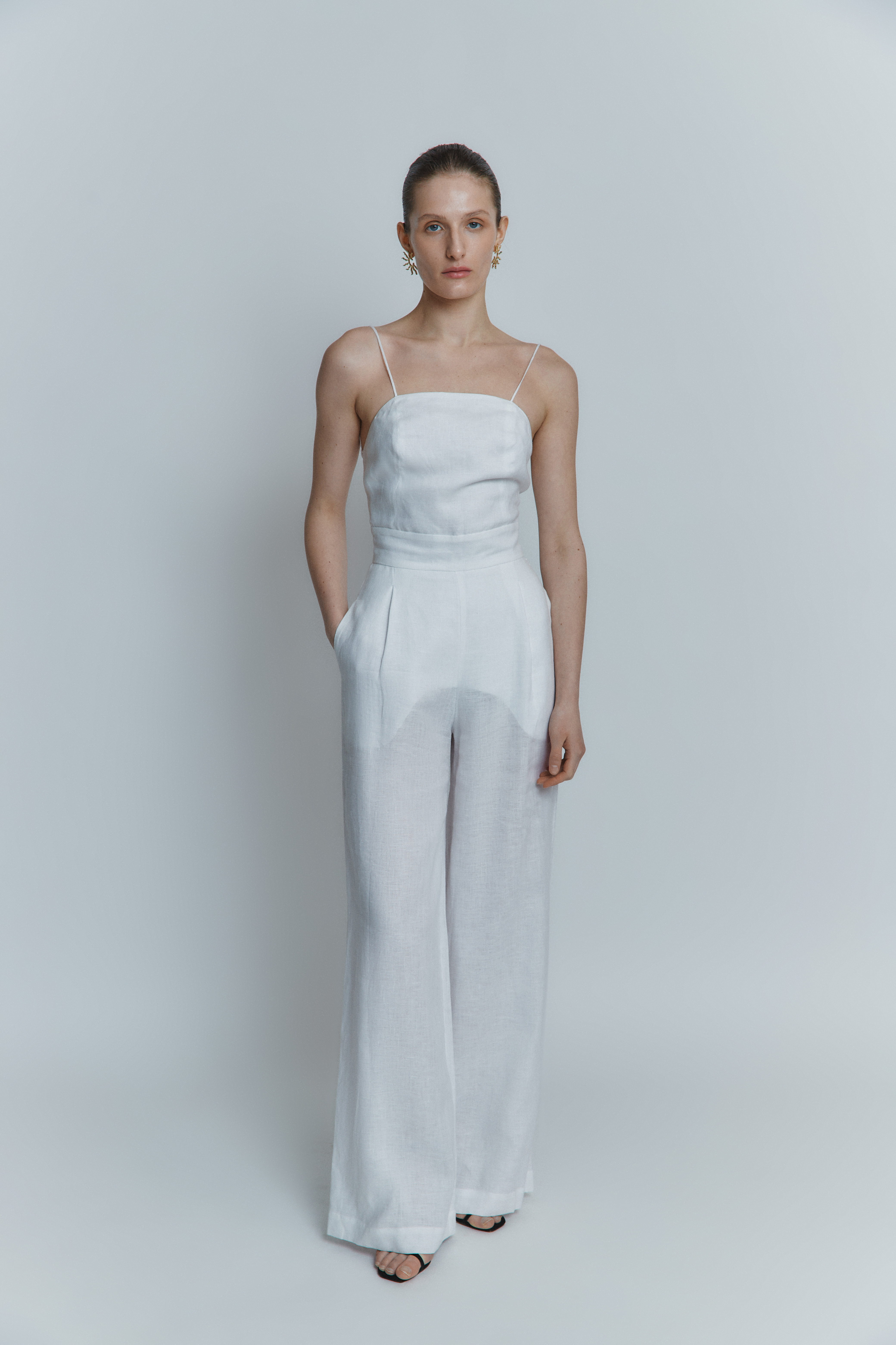 Linen long jumpsuit with an open back and delicate ties. It has wide legs and a detachable waistline, pockets in the side seams.