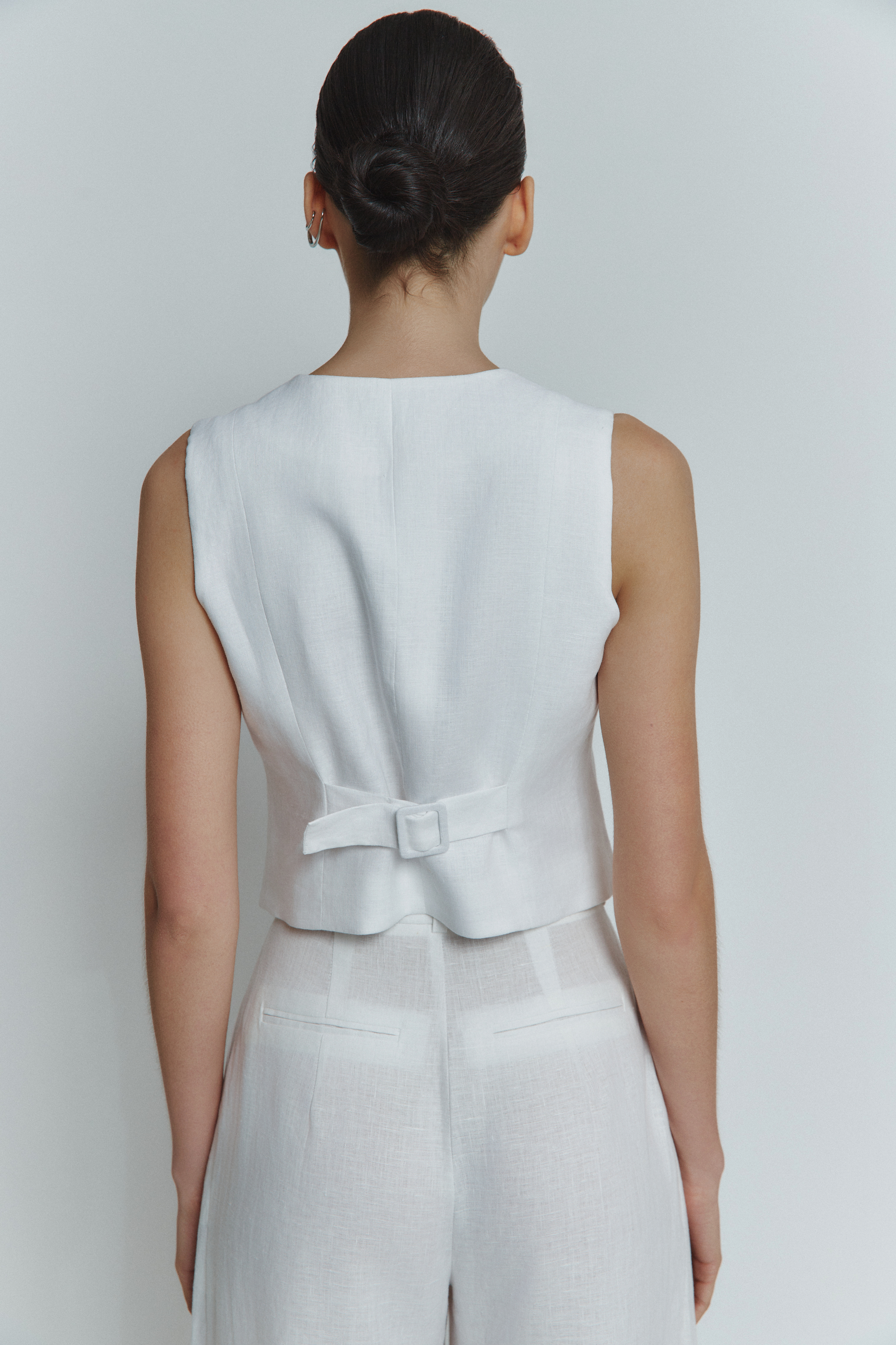 Cropped waistcoat with a fitted silhouette made of linen. It has vertical reliefs that shape the silhouette, non-functional slit horizontal pockets, a functional belt on the back with a drawstring to adjust the degree of fit. The model is lined with linen and has a decorative edging inside. Waistcoat with central fastening on mother-of-pearl buttons made of natural shell.