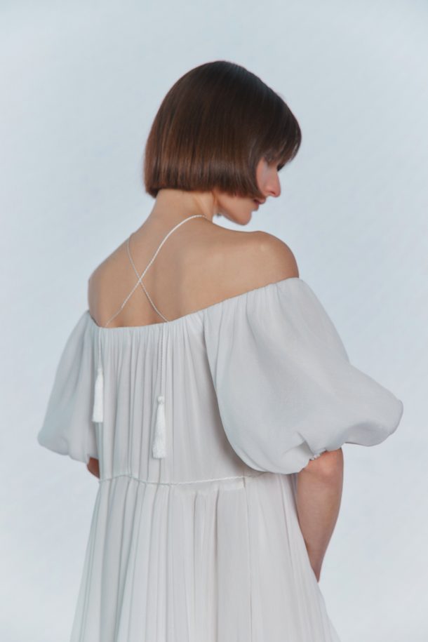 Сукня має резинку по плечах та низу рукавів — це дозволяє моделі м’яко триматися на фігурі без тиску, створюючи гарний силует. Внутрішня підкладка з батисту забезпечує комфорт і щільність. Ажурні шнурки з китицями та довгий вузький крученим поясом — ті деталі, що створюють настрій і додають легкості кожному кроку.
