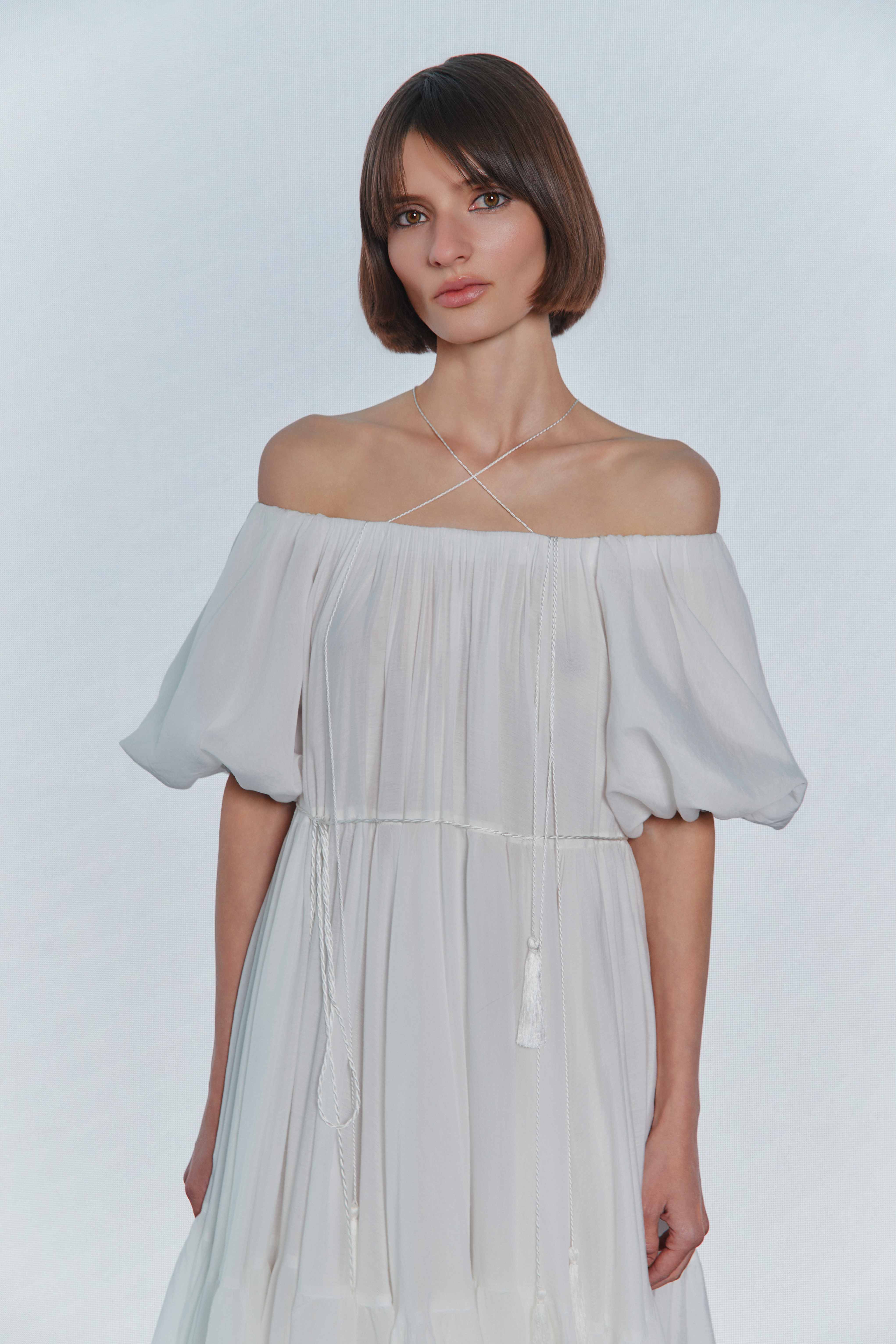 Ця молочна сукня з батисту — втілення жіночності та літньої свободи. Відкриті плечі додають образу витонченості, а напівпрозора текстура тканини надає легкості та романтичного шарму. Ідеальна для спекотних днів, прогулянок біля моря або особливих моментів на природі.