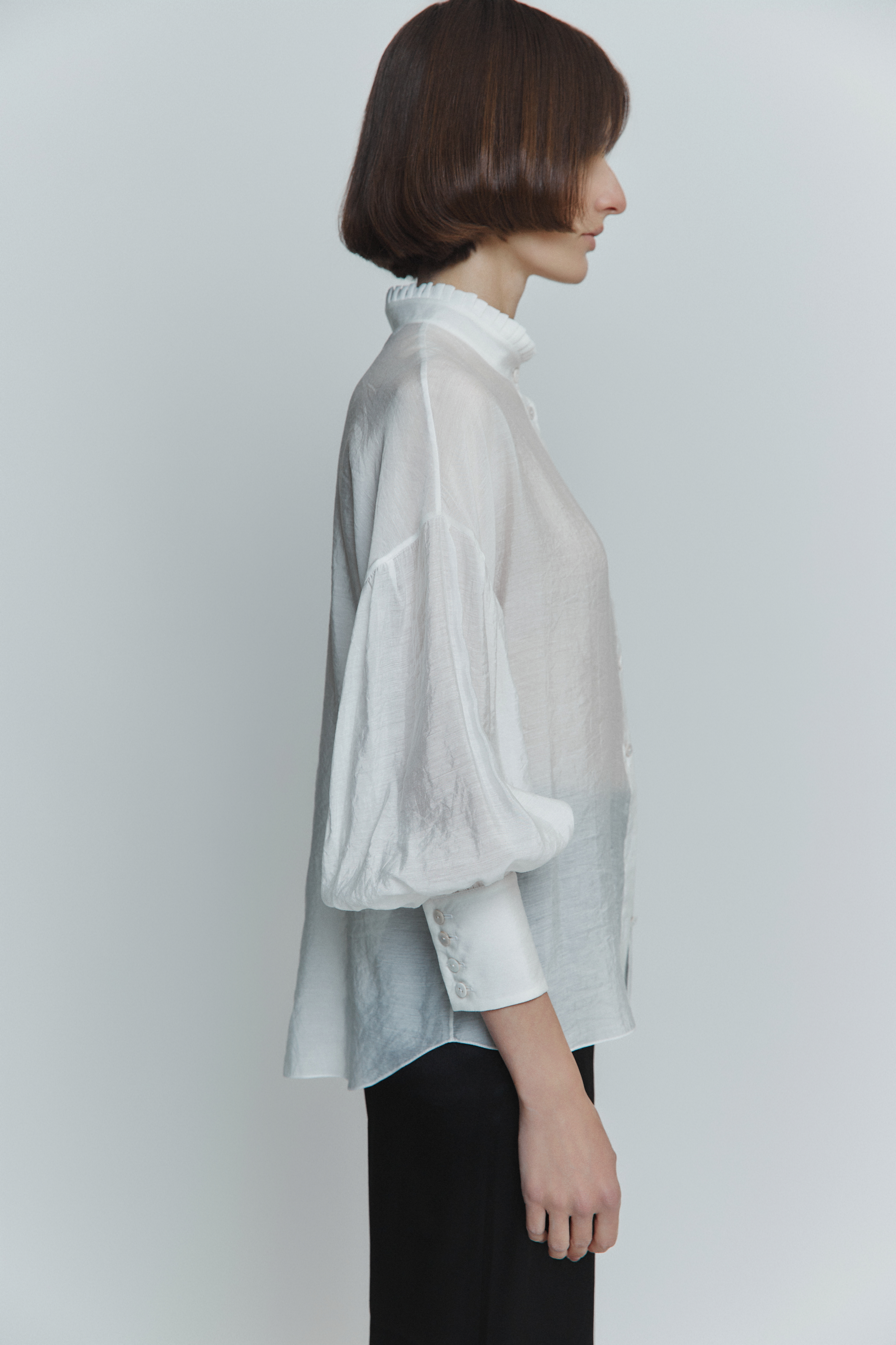 Комір, оздоблений акуратною рюшею, додає ніжного ретро-настрою. Центральна застібка на ґудзики з натуральної мушлі виглядає вишукано та натурально. Високі манжети надають завершеності образу, формуючи чітку лінію рукава та підкреслюючи стильний об’єм.
