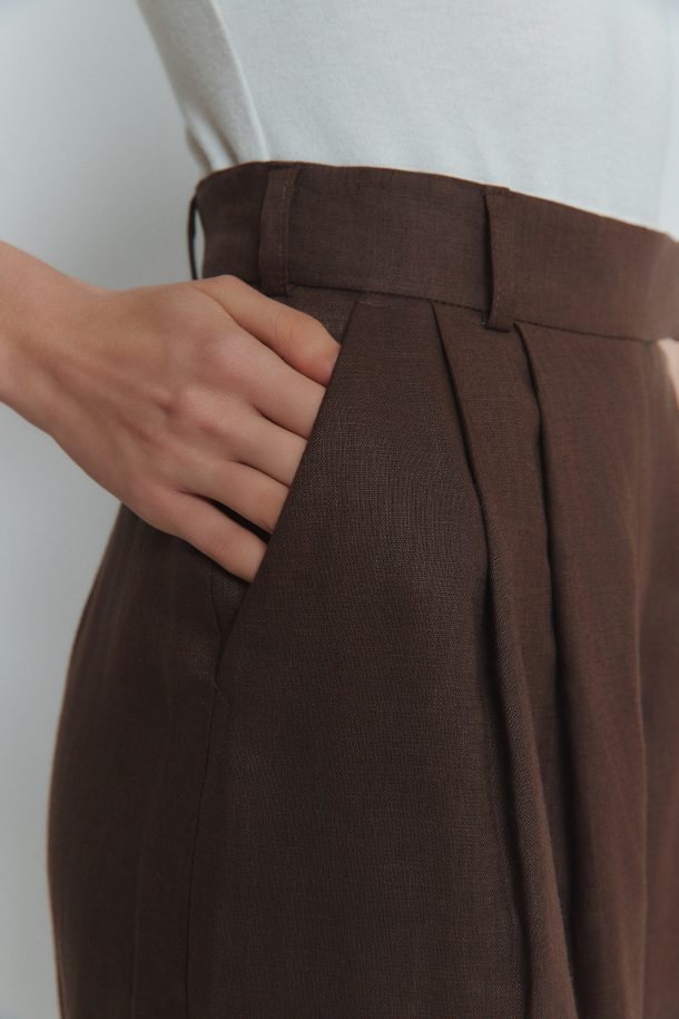 Шоколадні брюки палаццо зі складками по талії — це базова річ, яка додасть витонченості вашому образу. Вільний крій та акцент на талії роблять ці брюки універсальним елементом гардероба, що пасує як для офісного дрес-коду, так і для прогулянок містом чи вечірніх виходів.