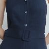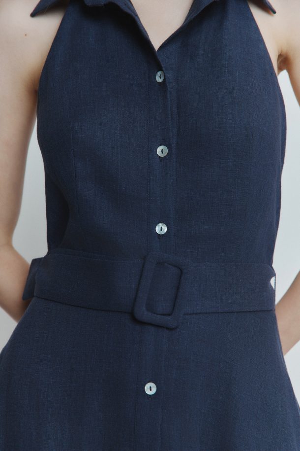 Вишукану відкриту спинку підкреслює застібка на ґудзик із натуральної мушлі на шиї. Спереду — вертикальна планка на такі ж ґудзики, що додає образу завершеності. Модель має кишені в бічних швах для зручності, зйомний пояс для акценту на талії та підкладку з тонкого батисту для повного комфорту навіть у спеку.