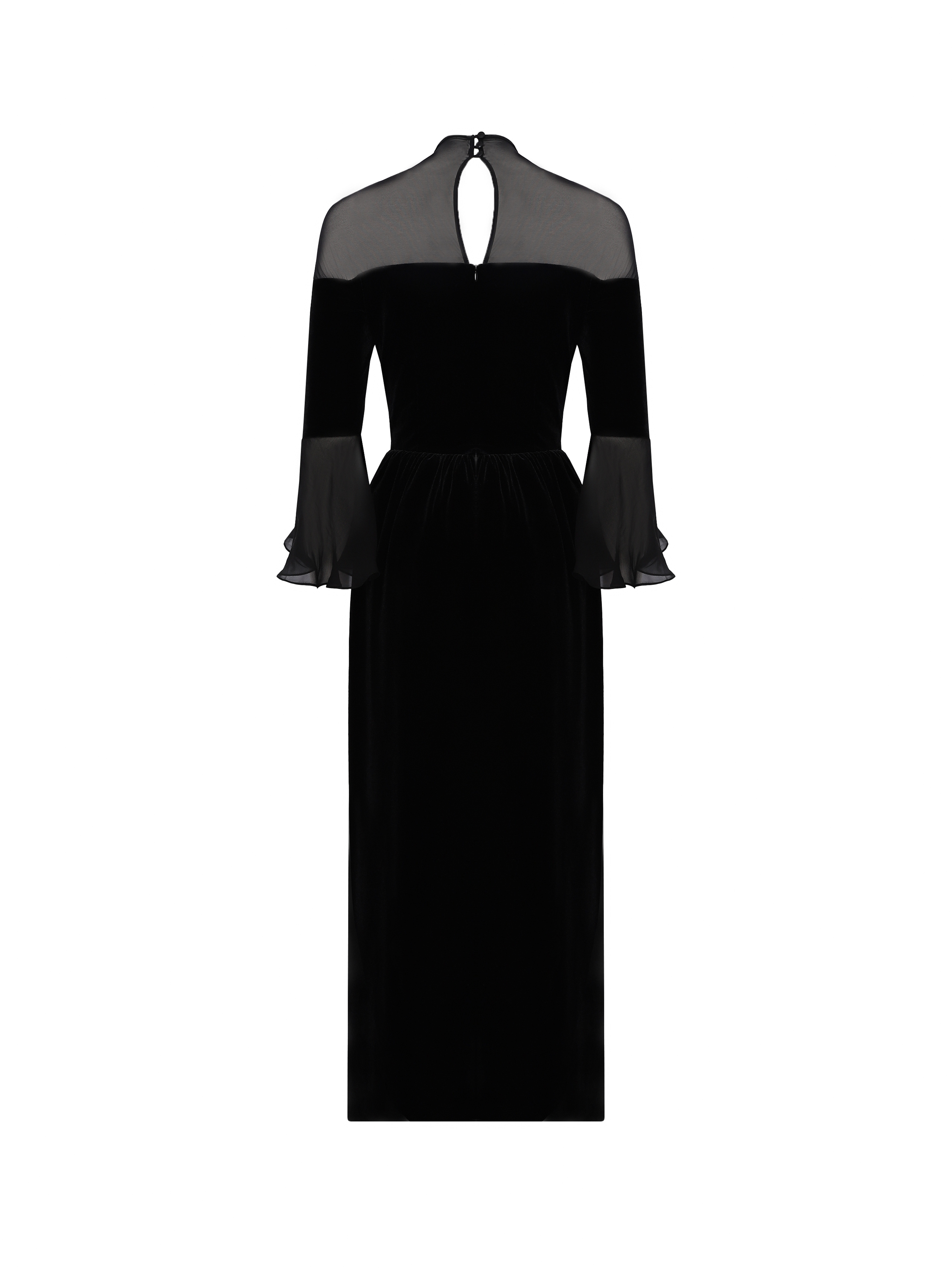 Ключовий елемент силуету — ніжні волани з шовку, що м’яко спадають по руці. Вони створюють ефект плавного руху та додають сукні художності. Лінія декольте оздоблена напівпрозорою сіткою, яка делікатно повторює форму тіла та додає легкого натяку на драму без надмірності. Талія виділена м’яким зборенням, що формує правильні пропорції та підкреслює силует. На спинці розміщена потаємна блискавка — непомітна, акуратна, зручна у використанні. Внутрішня підкладка забезпечує комфорт руху та ідеальне прилягання тканини.
