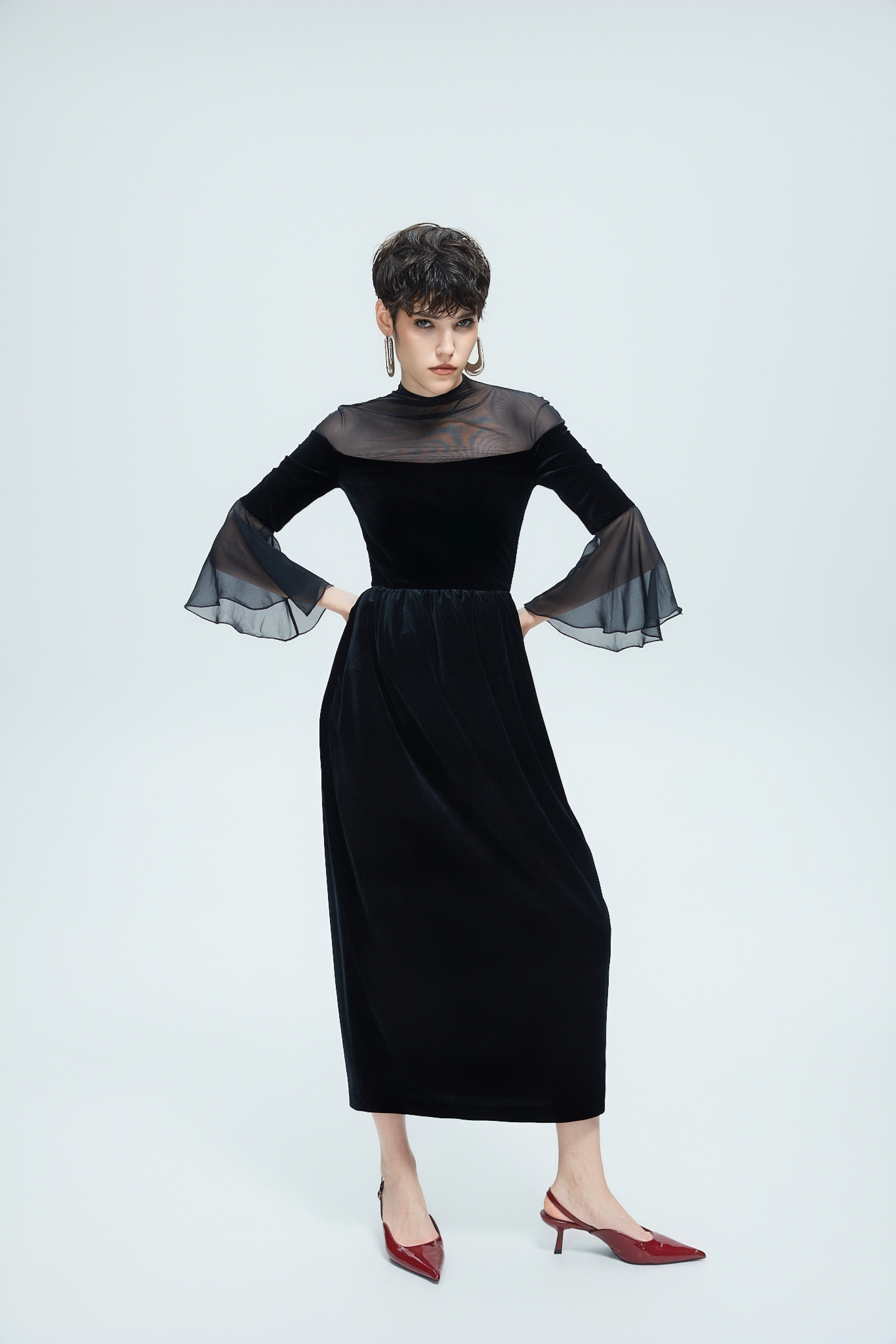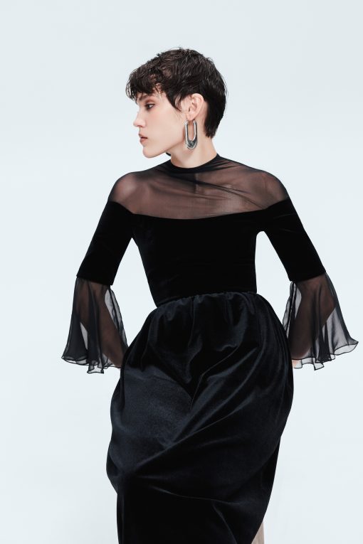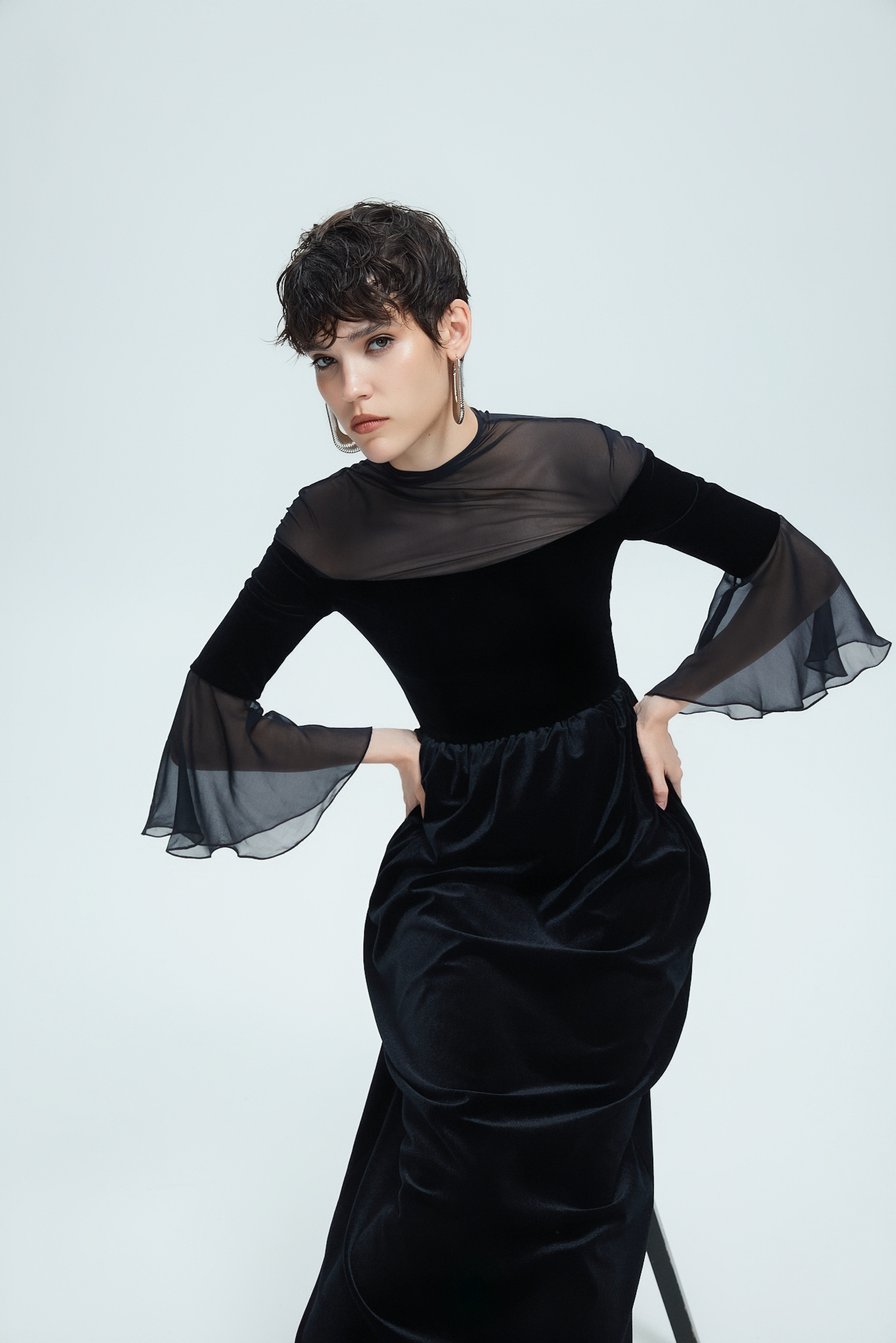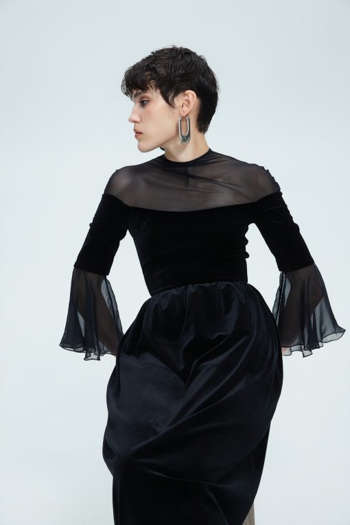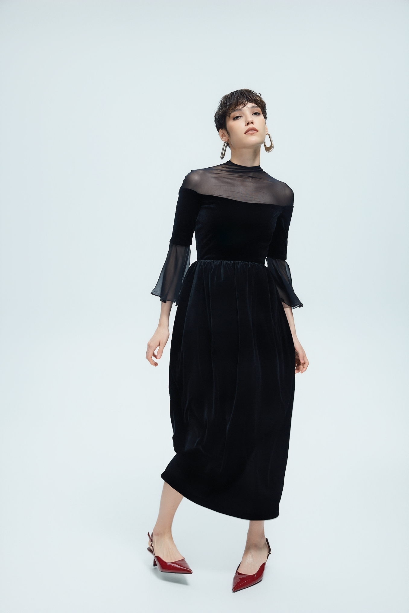Сукня міді з воланами — це поєднання класичної жіночності та сучасної театральної легкості. Виконана з оксамиту глибокого чорного кольору, вона має делікатний блиск, який переливається при кожному русі. М’яка фактура оксамиту підкреслює преміальність моделі, а довжина міді робить її доречною як для вечірніх зустрічей, так і для урочистих подій. Це сукня, яка не просто одягається — вона створює настрій, формує присутність і дозволяє відчути себе впевненою та бажаною.