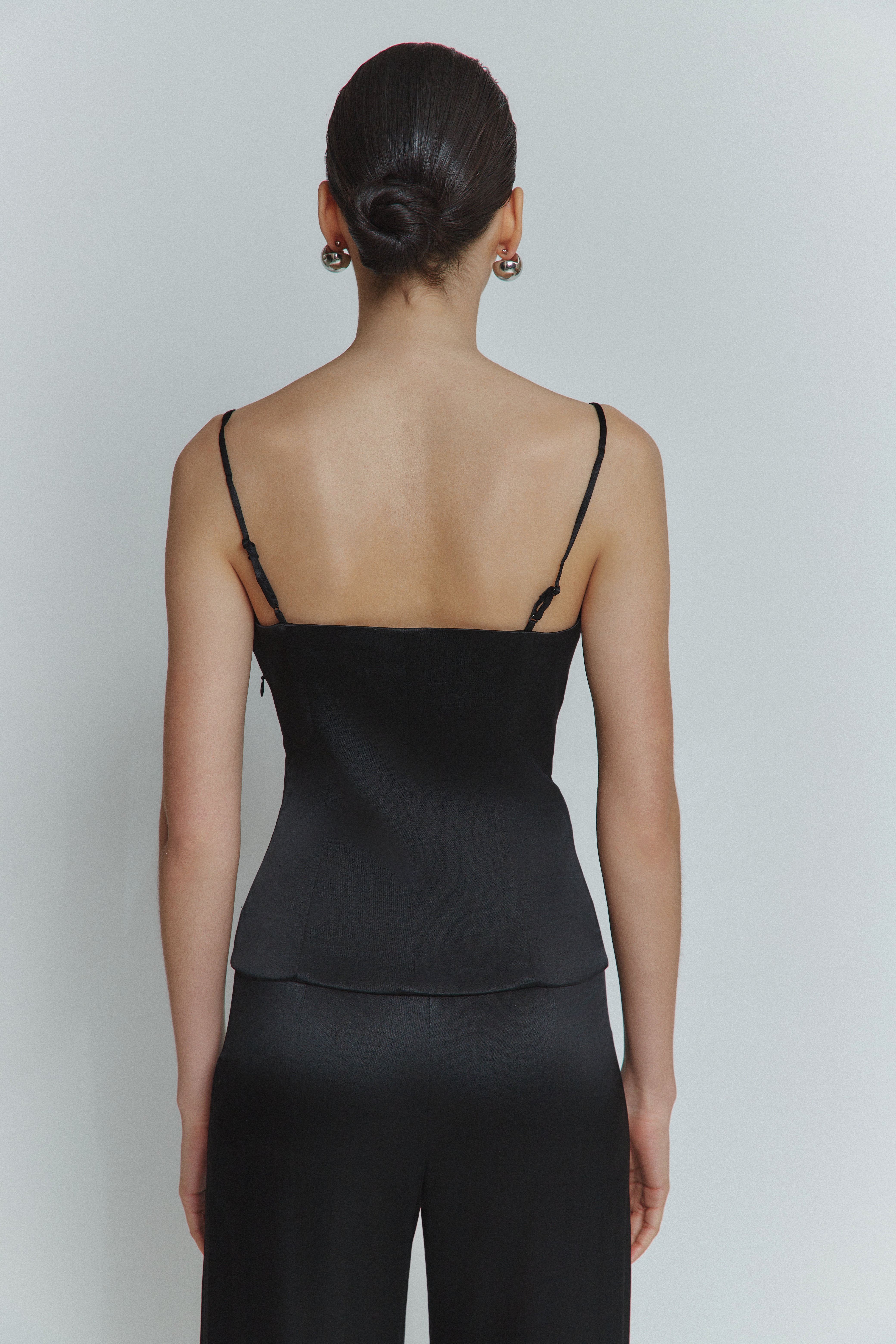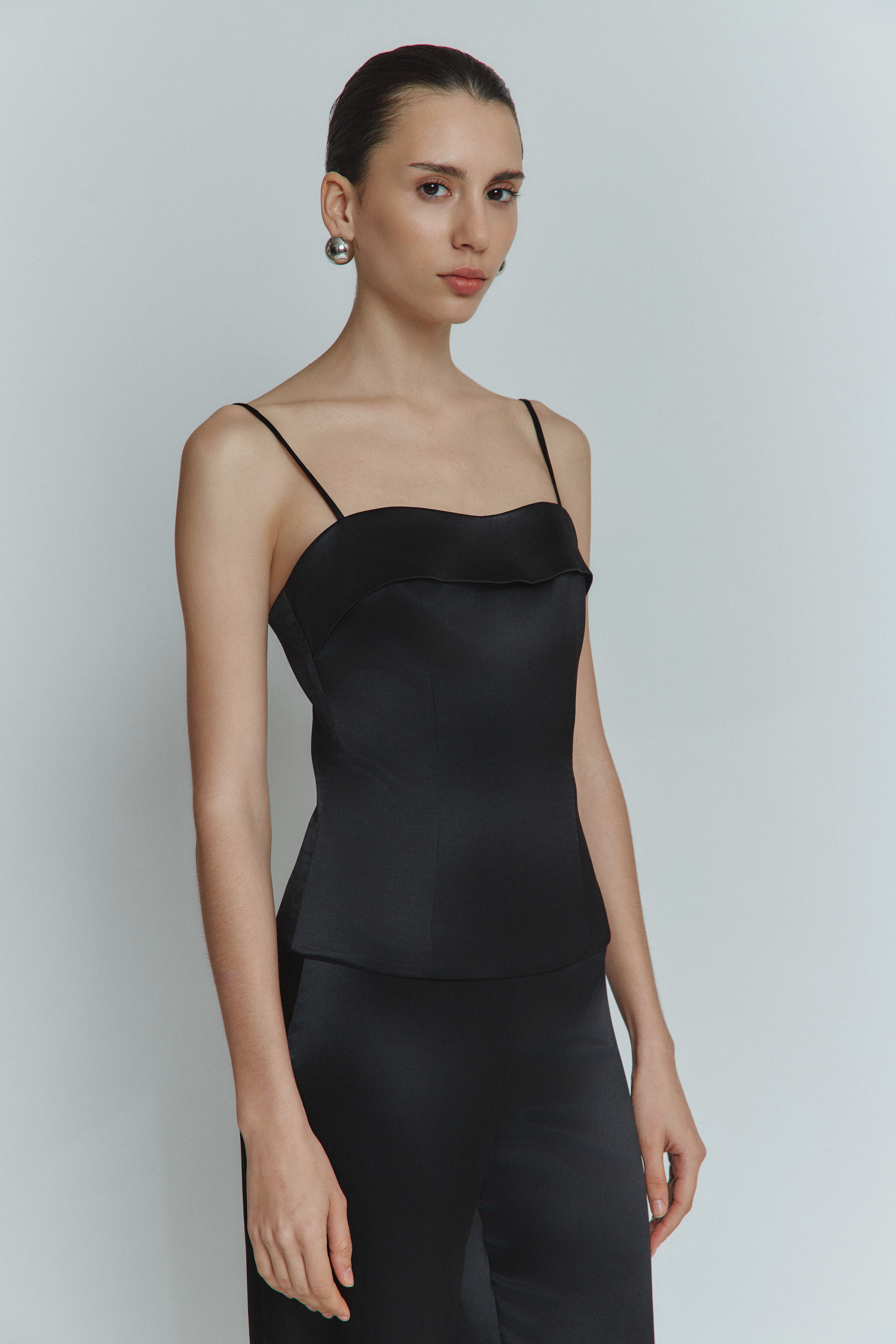 Цей топ з сатину чорного кольору — відмінне поєднання ціни та якості. Він стане відмінним доповненням до вашого базового гардеробу, не порушуючи вашого бюджету.